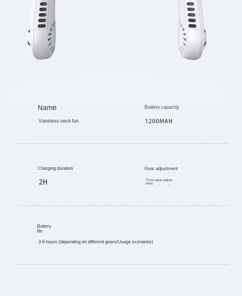 NeckBreeze™ lasts up to 6–10 hours on a full charge, depending on fan speed.